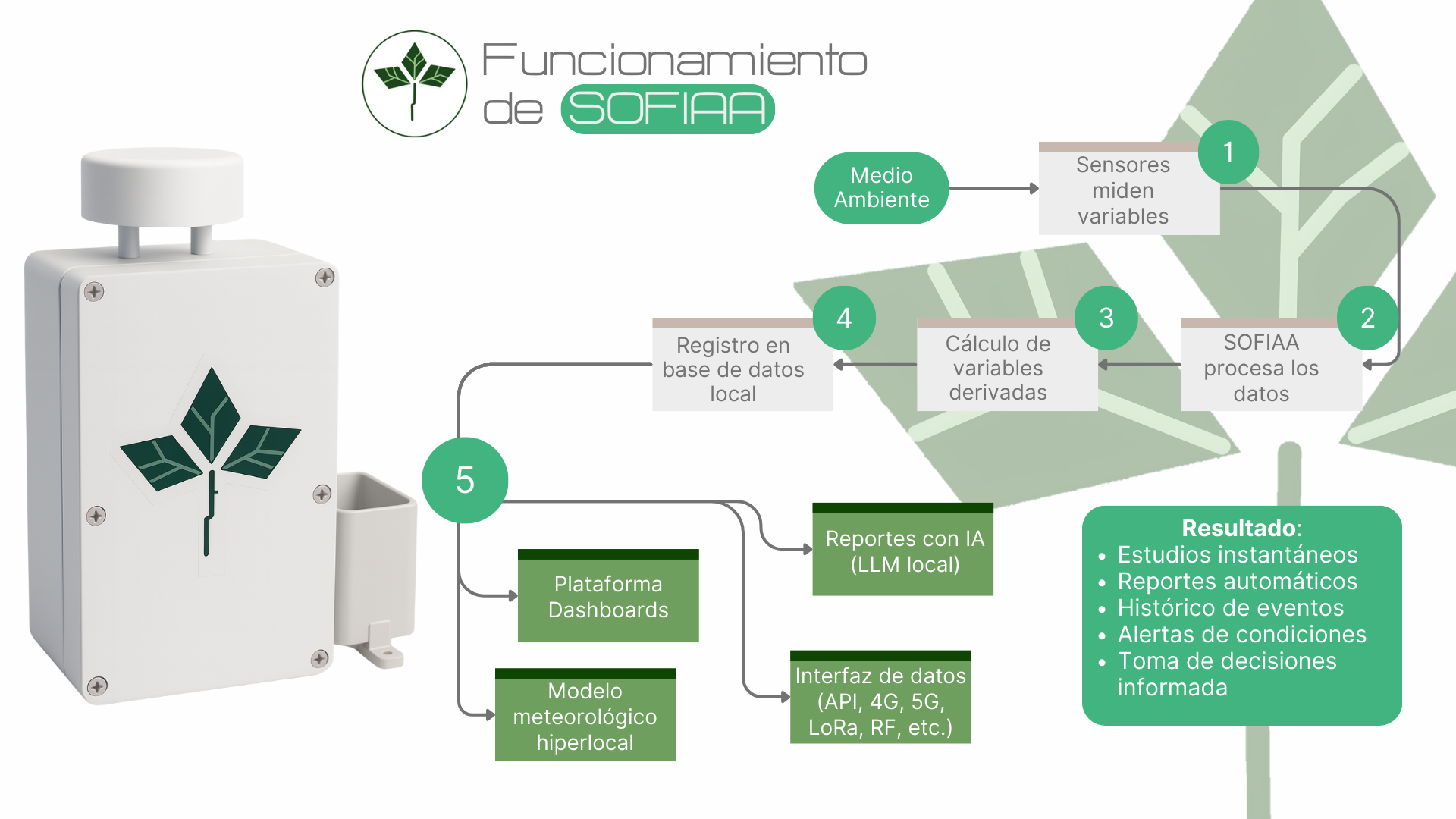 SOFIAA ATMOSPHERIC es una plataforma autónoma desarrollada por BIOTICFLOW que integra sensores ambientales, inteligencia artificial y comunicación avanzada para monitorear y analizar en tiempo real variables meteorológicas y ambientales.